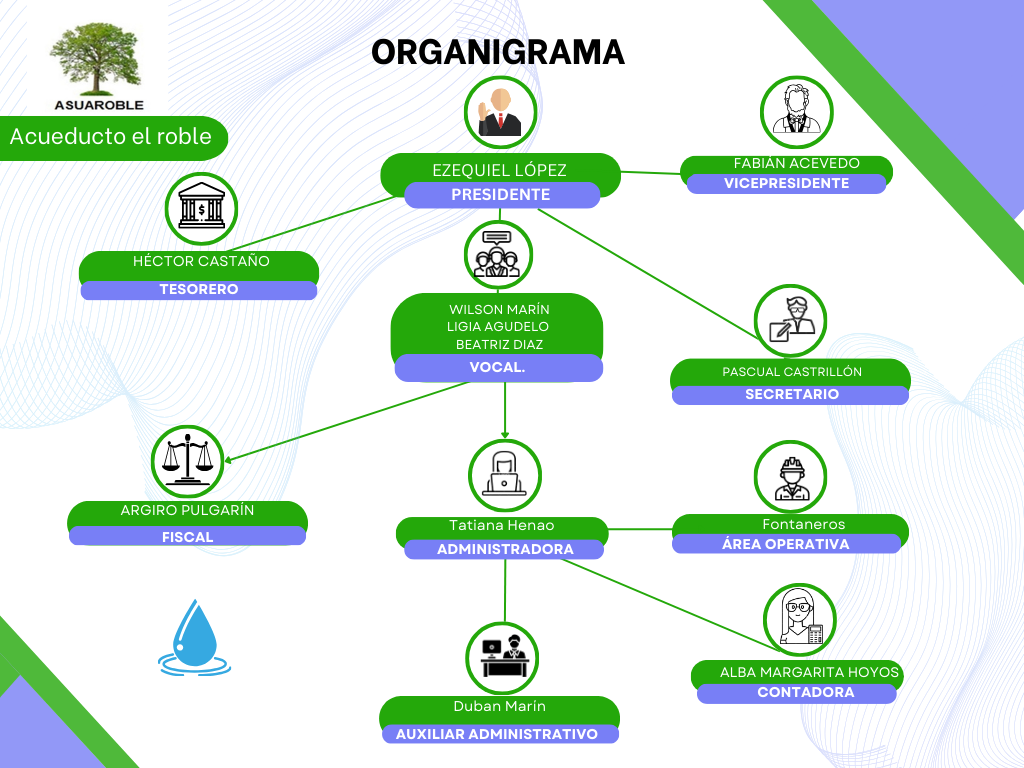 El acueducto está conformado por una Junta Directiva, en cabeza de un presidente o Representante Legal, y de la cual también hacen parte, un vicepresidente, un tesorero, un secretario, tres vocales y un fiscal